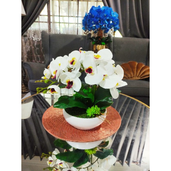 Edaman deco · cik puan gojes · dr gubahan bunga meja makan. Gubahan orkid latex semi premium 5 tangkai pasu seramik rendah size l height :